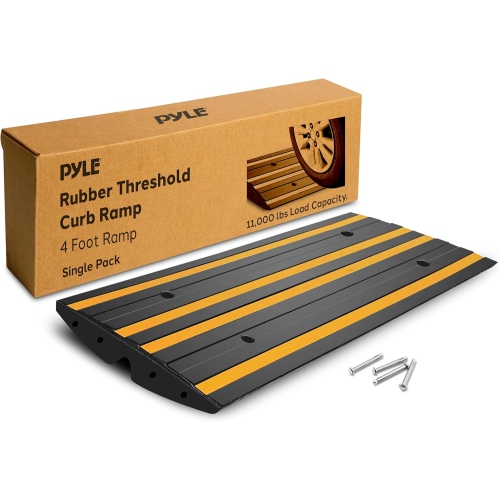 Pyle 4 ft. Rubber Curb Ramp, Non-Slip Threshold Single Ramp for Driveways & Sidewalks, Marine Grade Waterproof, Yellow Reflective Strips, Expansion Screws Included