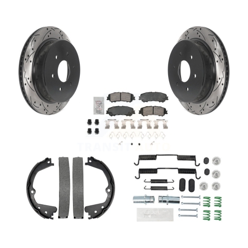 Rear Disc Drilled & Slotted Rotors Ceramic Pads Parking Brake Shoes And Hardware Kit For KDA-103593