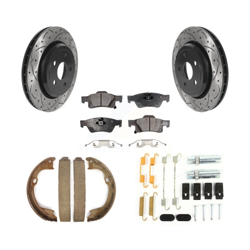Rear Disc Drilled & Slotted Rotors Ceramic Pads Parking Brake Shoes And Hardware Kit For KDT-101692