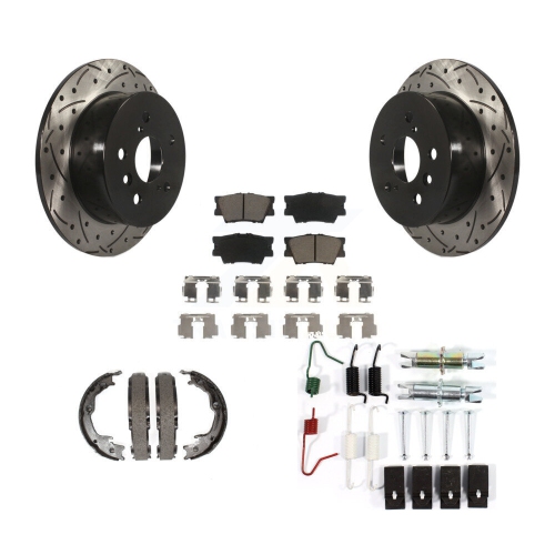 Rear Disc Drilled & Slotted Rotors Ceramic Pads Parking Shoes And Hardware Kit For Toyota KDC-101576