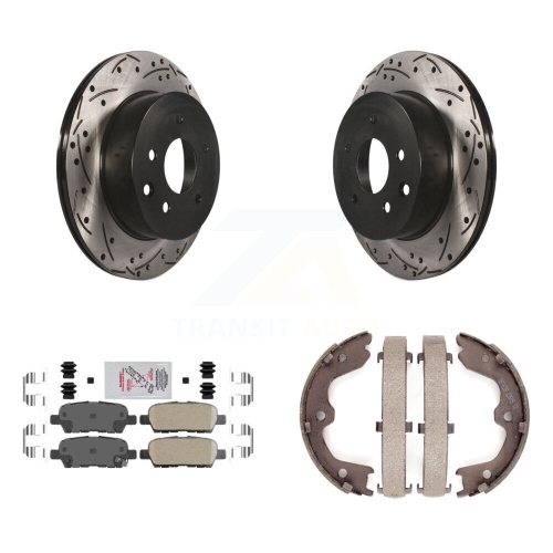 Rear Disc Drilled & Slotted Rotors Ceramic Pads Parking Shoes Kit For INFINITI G35 Nissan KDA-103418
