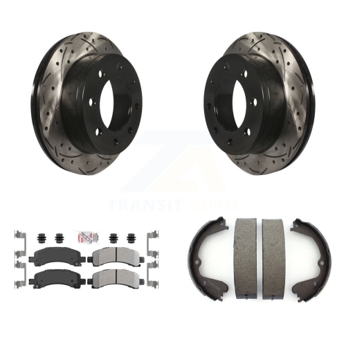 Rear Disc Drilled & Slotted Rotors Semi-Metallic Pads And Parking Brake Shoes Kit For KDA-103260