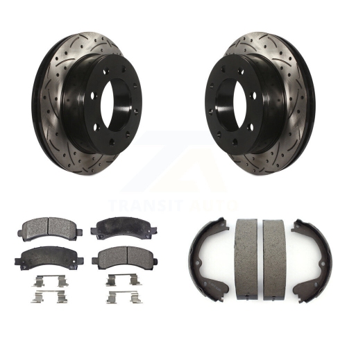 Rear Disc Drilled & Slotted Rotors Semi-Metallic Pads And Parking Brake Shoes Kit For KDF-101491