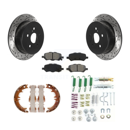 Rear Disc Drilled & Slotted Rotors Semi-Metallic Pads Parking Shoes And Hardware Kit For KDS-101438