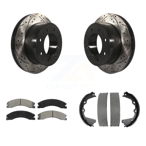Rear Disc Drilled & Slotted Rotors Semi-Metallic Pads Parking Shoes Kit For GMC Sierra HD KDS-101327