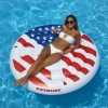 Red and blue patriotic swimming pool floating island. Features stars, stripes and peace sign. Inflatable is constructed of heavy duty vinyl; built to last