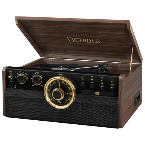 **This is a Refurbished product. A minimum 90-day warranty is included. See more information below. **The Victrola 370B 7-in-1 Nostalgic Belt Drive Turntable combines the nostalgia of a record player with the modern conveniences of wireless technology. Play CDs, cassettes, vinyl, or listen to the radio on this vintage inspired piece. Have fun connecting your own speakers, listening privately, or streaming your own music from up to 33 feet away.