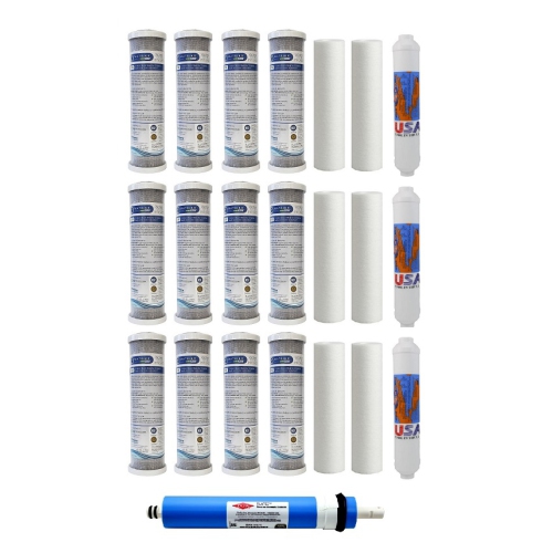 Name brand filters. Will fit all standard design 3,4, or 5-Stage reverse osmosis systems.Includes: 6 x Sediment filters12 x Matrikx CTO carbon filters 5 micron3 x Omnipure post filter1 x Dow Filmtec 50 GPD membrane