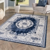 This ornate medallion rug has a scroll and floral pattern, adding modern Bohemian cottage style to a living room, bedroom, entry or kitchen. Varied tones of denim blue on an ivory background give this rug a hand-woven, rustic look.