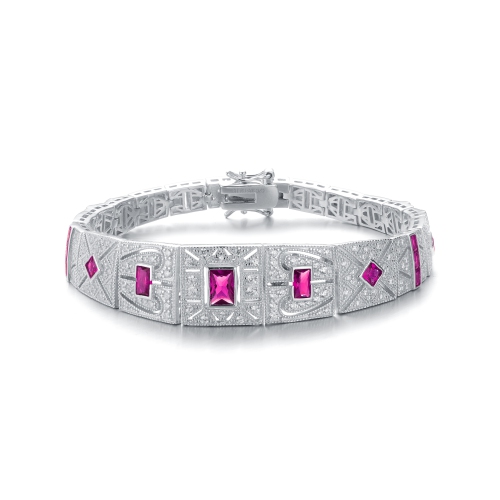 Classy sterling silver rhodium plated link bracelet. This stunning bracelet features an ruby red oval cubic zirconia stones and clear round cubic zirconia stones paved on the metal frame. Crafted of sterling silver with rhodium plating and secures with a box clasp. makes a great gift as well.