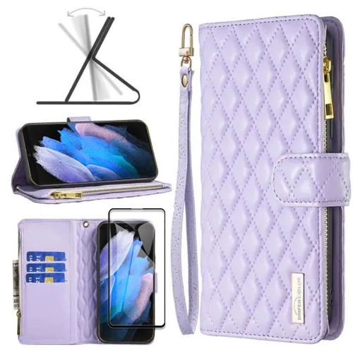Samsung Smart View Diamond Quilted Leather Protective Case Cover For Galaxy S23 Ultra Purple With Free Tempered Glass