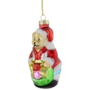 Santa bear glass Christmas ornament. Features green gift bag and presents. Fully dimensional; comes ready to hang