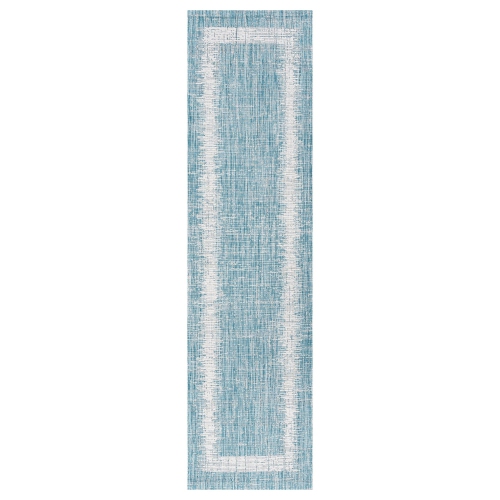 A simple ivory border is woven with a strie' effect on this seafoam aqua geometric rug. This versatile rug's minimalist look is perfect for a coastal cottage or modern outdoor patio.