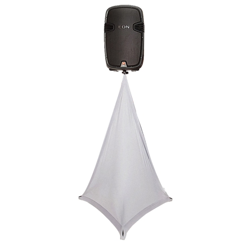 White triangle scrim to cover your speaker and lighting stands. Double side coverage. Stretch factor : Height 4 ft. to 7 ft. Bottom feet: 3.5 ft. to 4.5 ft.Features:Stretches from 4ft. to , 7ft.NFPA 701 approved Fire RetardantRequires a C-clamp or O-clamp at to attached top of the standComes in a custom tote