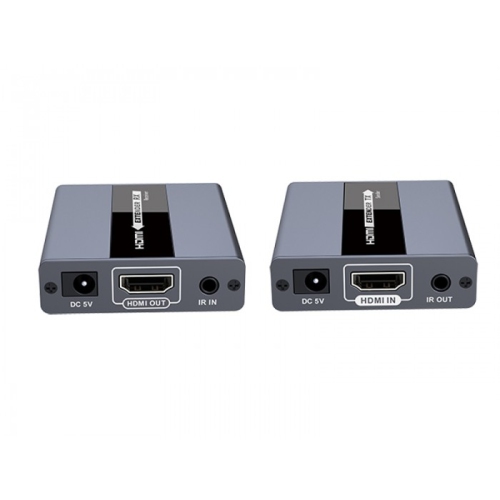The HDMI Extender 120m transmits uncompressed, zero-latency HDMI signals up to 120 meters. It supports full HD 1080p@60Hz resolution and is compliant with CAT5/5e/6 cables for long-distance transmission. The extender includes both a transmitter unit (TX) and a receiver unit (RX), working together as a pair.