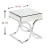 Create stunning space in your home with this mirrored end table. An elegantly bowed metal x-frame forms an enticing shape with the multifaceted tabletop. Beveled mirrors and a reflective chrome finish accentuate the chic look. This captivating end table adds instant glamour to contemporary styled homes.Features:Finish: ChromeMaterials: Chrome-Plated Square Metal Tube, Beveled Mirror, Particle Board and SiliconBeveled mirrors crea...