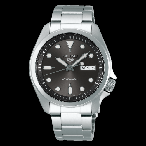 Seiko 5 sports automatic mens watch SRPE51K1. Stainless steel case and bracelet, grey dial. Automatic movement with manual winding. Case diameter 40 mm. Water resistance upto 100 metersr. Duration approx. 41 hours. Hardlex crystal. Lumibrite on hands and index(es). Three-fold clasp with push button release. Screw case back. See-through case back. 24 jewels, day/date display, stop second hand function.