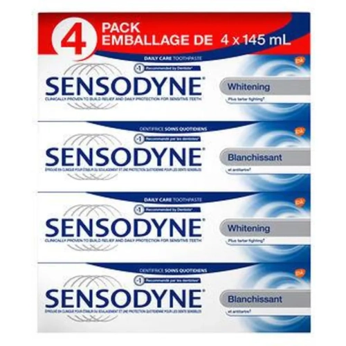Experience relief with Sensodyne Whitening Toothpaste. This bundle includes 4 tubes, each containing 145 mL of toothpaste. Formulated with medicinal ingredients like potassium nitrate and sodium fluoride, it helps alleviate tooth sensitivity while promoting oral health. The non-medicinal ingredients contribute to a refreshing flavor and effective cleaning.