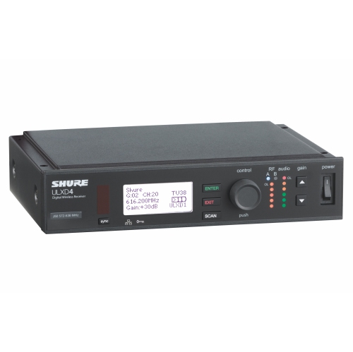 The Shure ULXD4 is a half-rack, networkable wireless receiver for use with ULX-D®, Digital Wireless Systems.With an expansive set of professional features, including 24-bit / 48 kHz digital audio quality, efficient and intelligent RF performance, and AES 256-bit encryption, ULX Digital offers uncompromising wireless tailored for professional sound reinforcement.FeaturesPredictive switching