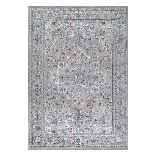 Featuring an ornate ivory medallion design on a light gray base, our area rug boasts an exceptionally plush underfoot feel. Accented with blues and reds, it has the look of a tradition Persian style, but in the modern materials of today.