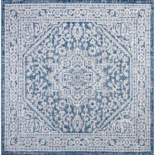 This ornate medallion rug's lively pattern adds exotic style to an outdoor porch or patio. Varied tones of blue and navy mingled with a gray pattern give this rug a hand-woven, vintage vibe.