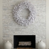 Unlit snow white artificial pine Christmas wreath. No assembly required; wreath comes in one piece. Includes a heavy duty ring for easy hanging