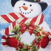Snowman outdoor Christmas garden flag. Double sided design with a snowman holding a wreath. Flagpole fits into the sleeve; flagpole not included