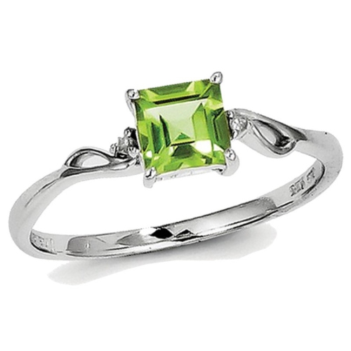 A beautiful green peridot princess square cut gemstone ring set in sleek sterling silver with rhodium plating.