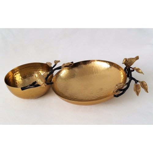 Delightful songbirds twin bowl displays songbirds perched on the branch along the rim. The golden stainless steel bowls works great for serving condiments, dips, nuts, or candies.