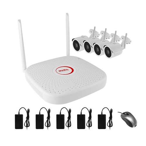 - 1x 4CH WIFI NVR H.264 - 4x 1080P Outdoor Bullet IP Camera IR 30m - 4x DC12V/0.5A Power Adapter for WIFI IP Camera - 1x DC12V/2A Power Adapter for WIFI NVR - 1x USB Mouse - 1 Sata x Upto 6TB Hard Disk