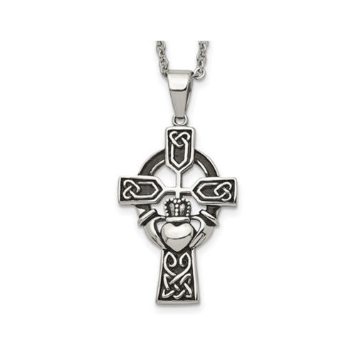 This Celtic inspired cross pendant is crafted from antiqued stainless steel with Claddagh design. The pendant hangs from a 20 inch cable chain included and weighs 7.40 grams with a lobster clasp.