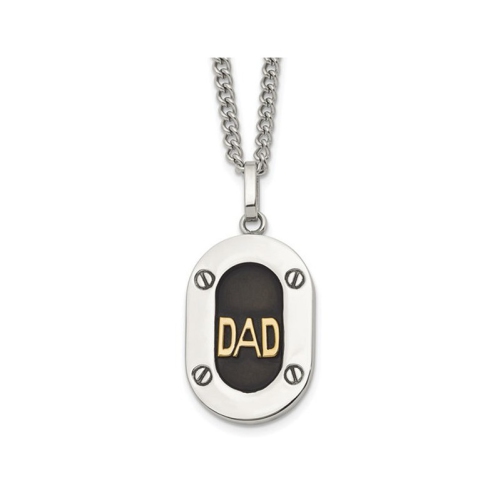 Show him you love him with this DAD pendant he can be proud to wear. Crafted from strong stainless steel the word Dad is overlayed on top of a black enamel center including an 24 inch curb chain. This pendant is 1 1/3 inches in length and 4/5 inches in width, weighs 21.41 grams.