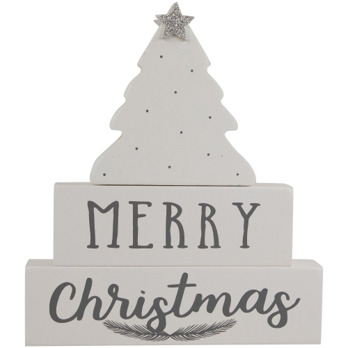 Stacked Christmas block tabletop decoration. Reads Merry Christmas or Warm Christmas. Christmas tree is accented with a silver glittered star