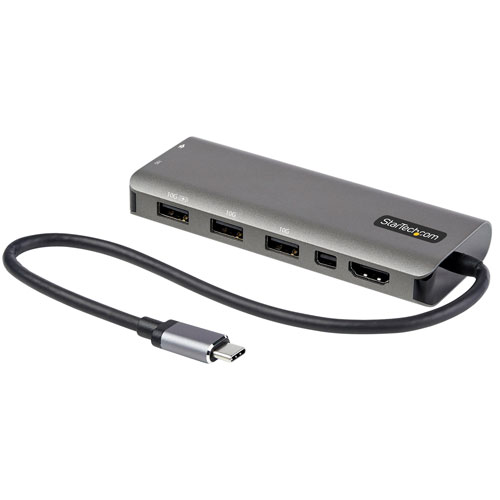 Connect more devices to your laptop with the StarTech USB-C multiport hub. This versatile device features one HDMI, one mini DisplayPort, three USB 3.2 Type-A, one USB Type-C USB power delivery only, and one USB 3.2 Type-C port for flexible connectivity. Both HDMI and mini DisplayPort outputs support up to 4K 60Hz (DP 1.4 Alt Mode) or up to 4K 30Hz (DP 1.2 Alt Mode).