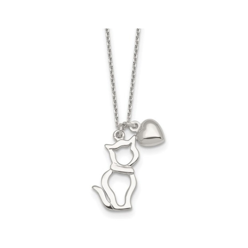Steling Silver Cat Silhouette and Puffed Heart Pendant Necklace with Chain