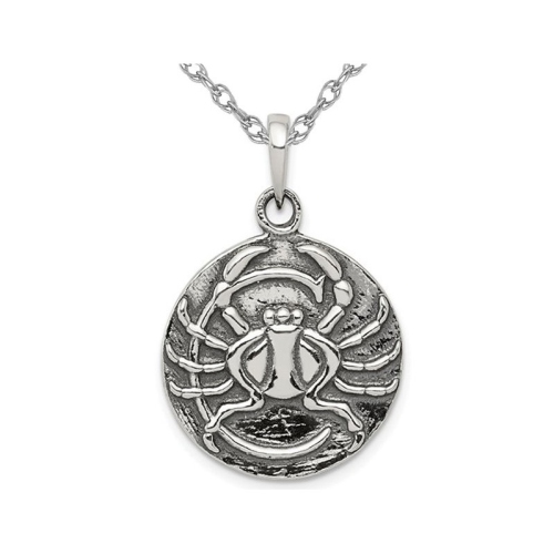 Crafted from polished and antiqued sterling silver this crab inspired astrological zodiac sign CANCER pendant you will be proud to wear. This circle charm pendant is 4/5 inches wide and 4/5 inch in length and weighs 4.40 grams. This pendant is Part of the Gem & Harmony Astrology Signs Collection. A collection that includes different astrological signs and motifs. This silver zodiac charm pendant i