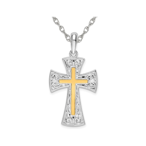 Exquisitely crafted in rhodium plated sterling silver this cross pendant is a beautiful symbol of your enduring faith and features a central yellow plated cross for extra style. Complete with matching 18 inch sterling silver chain, this will make a beautiful accessory for every occasion. The cross is 1 inch in length and 4/5 inches wide and weighs 3.80 grams.