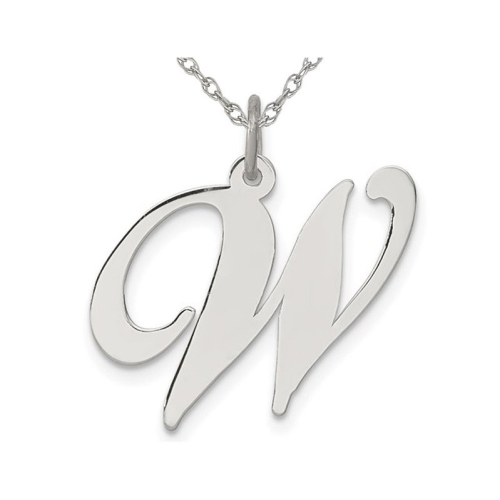 A stylish and meaningful gift for yourself or someone you love, this letter initial - W - pendant is fashioned in polished rhodium plated sterling silver. The look is complete with a matching 18 inch silver chain, for an elegant accessory you'll love sporting at every opportunity. This classic fancy script design is 4/5 inch in length and 3/4 inches wide and weighs 0.72 grams. This pendant is part