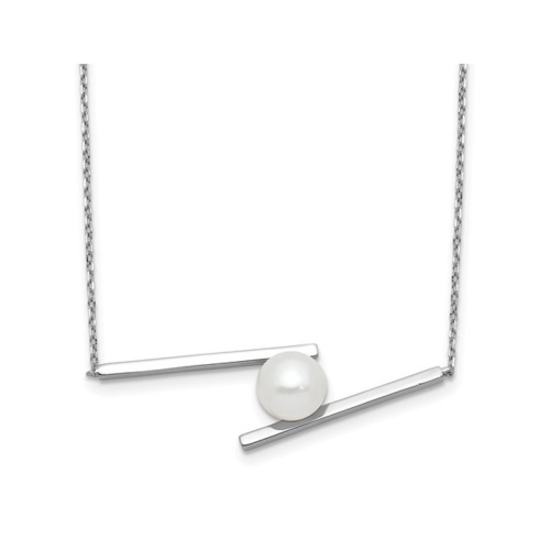A white round cultured freshwater pearl 8-9mm sits in the embrace of this horizontal stick inspired sleek sterling silver with a matching chain 16 inch chain with 1.5 inch extension. Pearl is the birthstone for June.