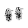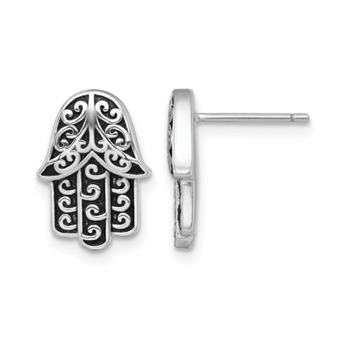 Beautifully crafted hamsa earrings crafted from antiqued and polished sterling silver. These button post earrings weigh 4.00 grams and are 1/2 inch in length.