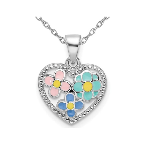 This beautiful pendant is designed with a heart shaped design with beautiful pink, green and blue enamel flowers at its center. The pendant is from sleek sterling silver and includes a matching sterling silver 18 inch chain, this endearing accessory is the perfect way to make her smile. The pendant is 1/2 inch wide and 1/2 inch long and weighs 1.15 grams.