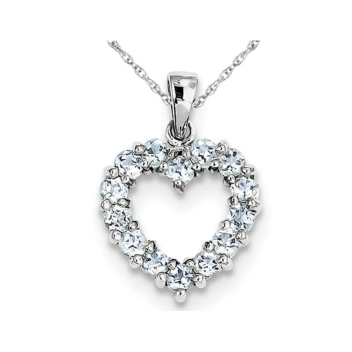 A beautiful rhodium plated sterling silver heart pendant with alluring aquamarine gemstones the birthstone for March hangs from an 18 inch sterling silver chain included.