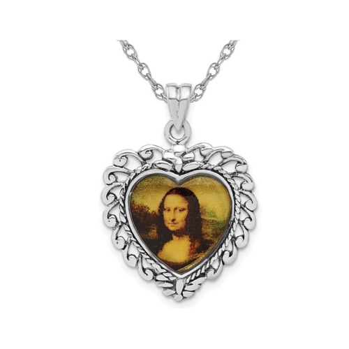 Sleek sterling silver is crafted into an antiqued style heart which surrounds the enamel picture of Mona Lisa. This beautiful charm pendant includes a matching 18 inch silver chain and is approximately 7/8 inch wide and 1 1/5 inch in height and weighs 3.20 grams.