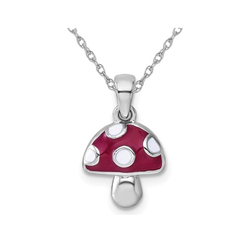 Stelring silver is crafted into a polished mushroom charm pendant with red enamel completing the look. This silver pendant weighs 0.95 grams and is 2/5 inch in width and 1/2 inches in length. This cute charm pendant inludes an 18 inch sterling silver chain.