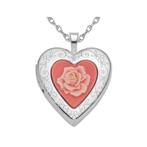 Sterling Silver Pink Resin Rose Cameo Heart Locket Pendant Necklace with Chain