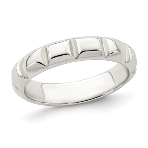 Wonderfully polished smooth at its center flowing sterling silver and features notched design that fashion a really sleek look. This silver band weighs 3.60 grams.