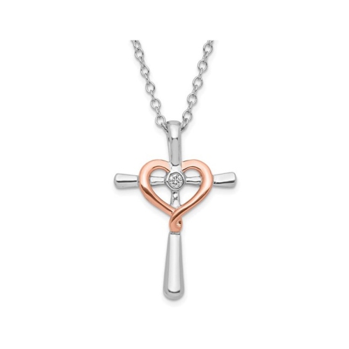 This simple pendant is crafted from polished sterling silver a rose plated heart. This sleek pendant measures 7/8 inch length and and 2/3 inch wide and weighs 1.27 grams. Comes with an 18-inch polished white sterling silver chain for easy adornment. A single tiny accent diamond sits at the very center of the heart cross.