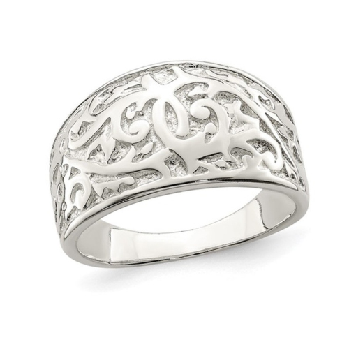 This uniquely designed ring is crafted from a gleaming polished sterling silver foundation formed into an impressive swirl motif. This silver ring weighs 5.75 grams.
