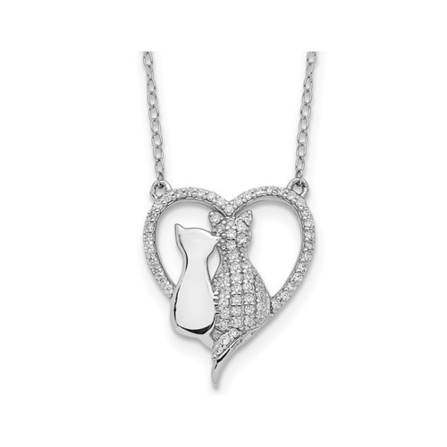 Sterling Silver Two Leaning Cats Heart Pendant Necklace with Cubic Zirconia (CZ)s and Chain