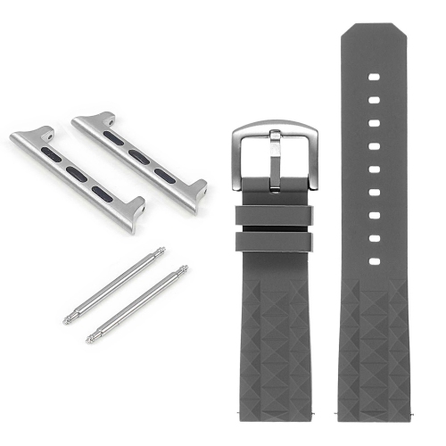 StrapsCo's super waffle rubber watchband for Apple Watch is a modern version of a vintage original for Seiko dive watches. These functional diver straps are constructed with thick premium silicone rubber and embossed with a diamond waffle pattern. The underside edges of the band feature vented grooves for breathability. Finished with a brushed stainless steel buckle. Fitted with matching removable adapter so you can wear one of our best-selling classic watch bands with your Apple Watch.